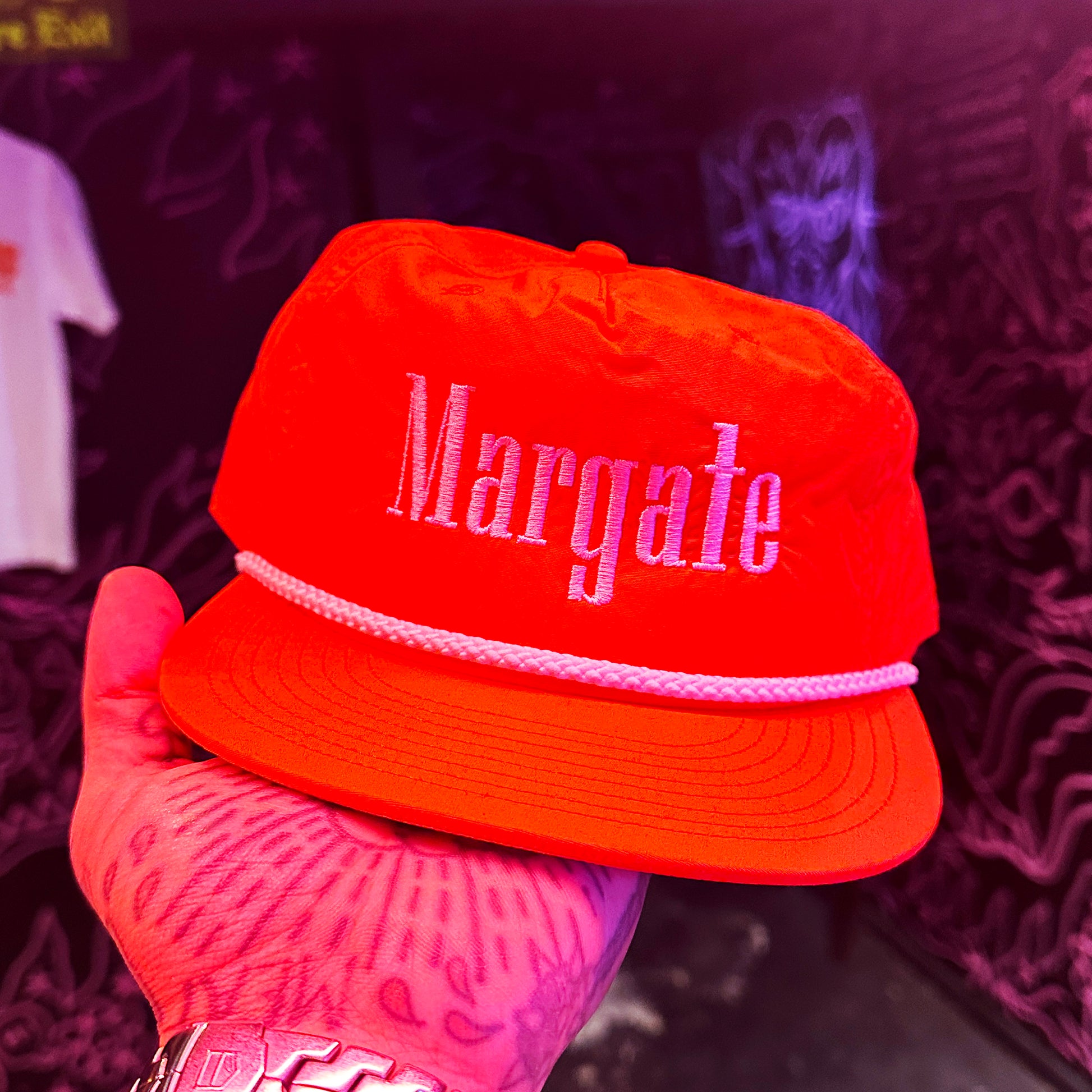 Waterproof red cap with white rope detail.